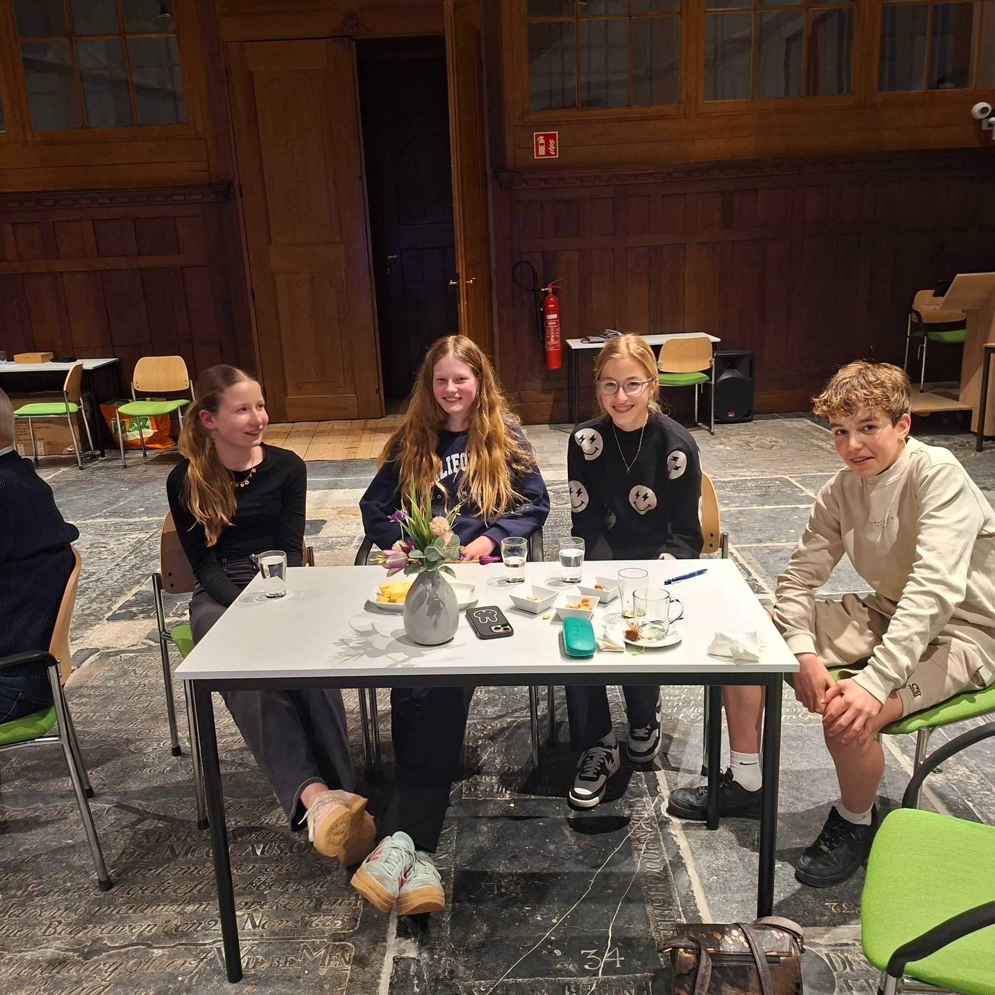 De foto met de 4 jongeren aan tafel is gemaakt op vrijdagavond 27 maart bij de pubquiz in de Martinikerk, georganiseerd door World Servants actiegroep Sneek Zuiderkerk. We zijn als derde geëindigd, het was vooral gezellig.