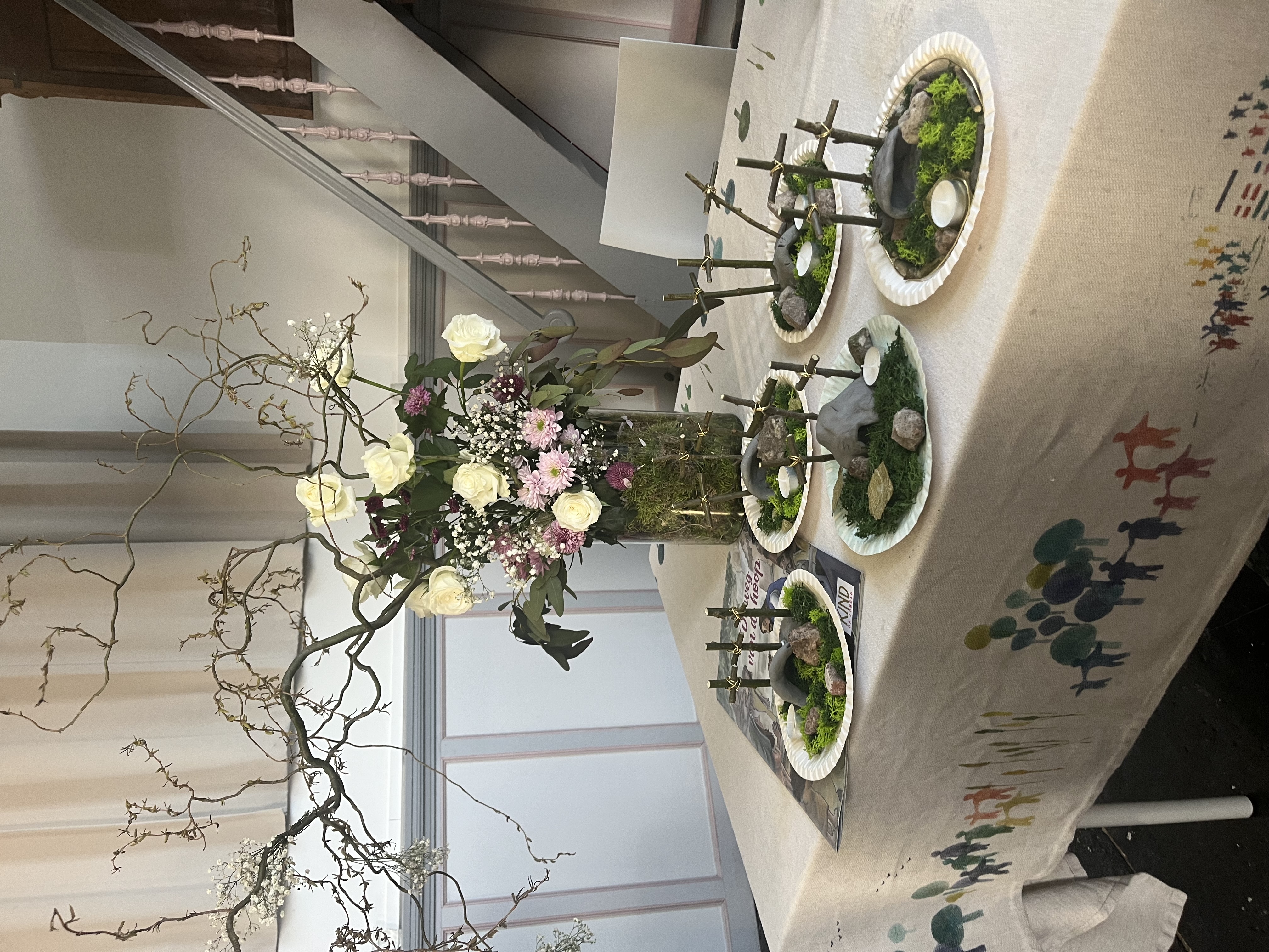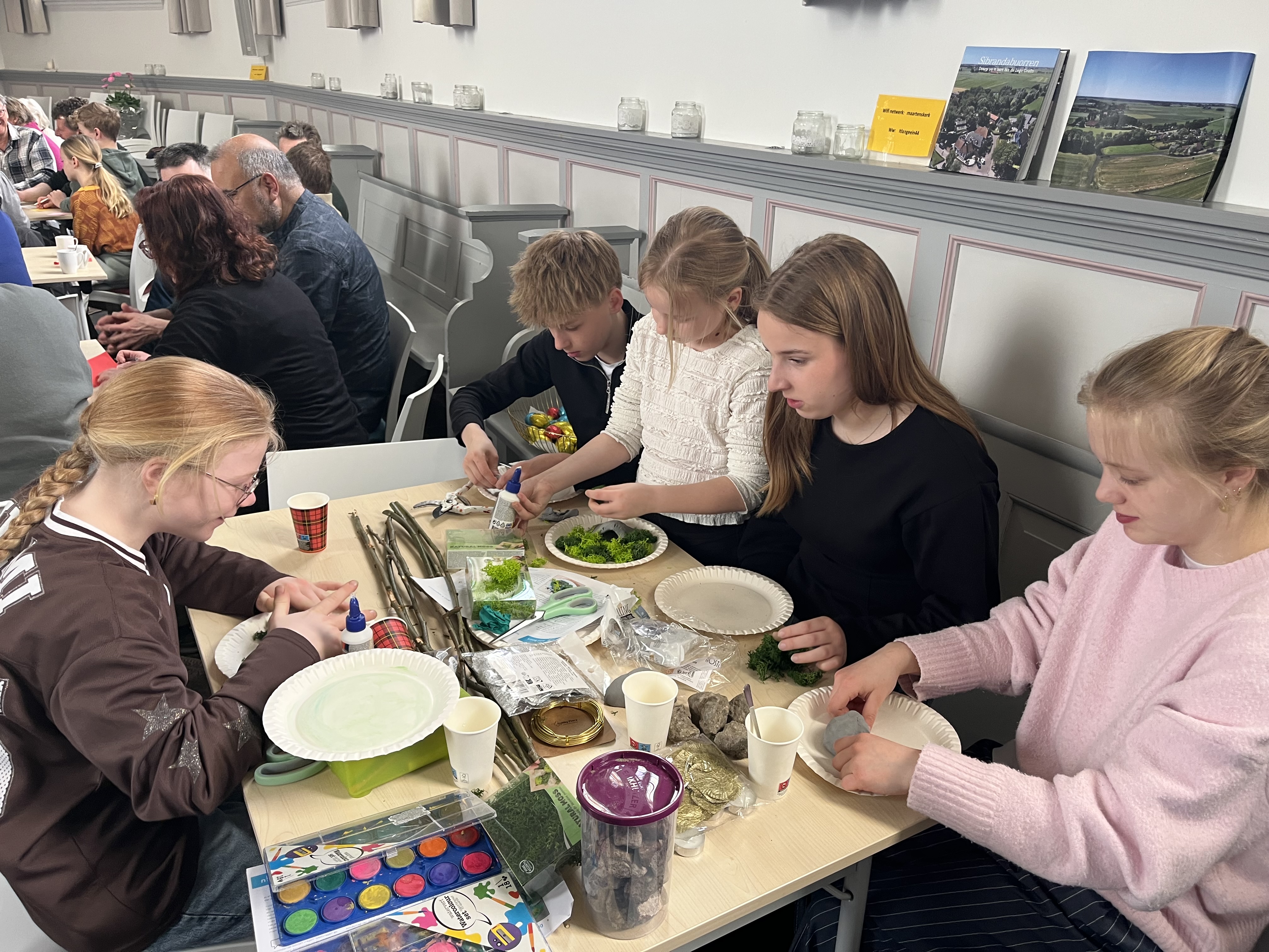 We knutselden met elkaar paastuintjes, die te zien zijn op de foto, ook ziet u hier het liturgisch bloemstuk.
