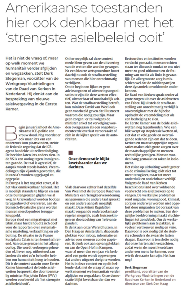 Graag verwijs ik u naar bijgaand artikel van Derk Stegeman, voorzitter van de Werkgroep Vluchtelingen van de Raad van Kerken, in het Nederlands Dagblad: