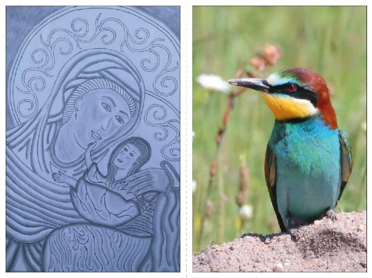 Kunstwerk (links) op de cover van de paasgroetenkaart 2026: 'Zoals deze moeder haar kind liefheeft en beschermt, zo houdt Jezus onvoorwaardelijk van ons. Hij droeg onze pijn, stierf aan het kruis en overwon de dood uit liefde voor ons.' Deze afbeelding is gemaakt door een gedetineerde in de PI Nieuwegein.